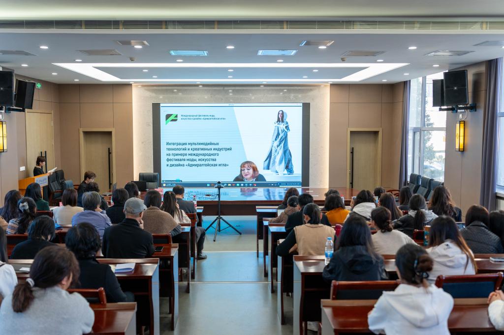 俄方专家伊琳娜·索什尼科娃与阿莲娜·霍赫洛娃以《多媒体技术和创意产业的整合》为题,结合国际时尚艺术节“海军针”的成功实践,系统展现了数字技术在服装创意设计、品牌传播等领域的前沿应用成果;中方专家王珺英教授通过《传统服饰艺术及创新设计》主题分享,深入剖析了中国传统文化元素与现代服装设计的融合逻辑与实践路径;北京金玉茉莉服饰技术总监赵莉则聚焦非遗技艺的当代传承,以《旗袍的传统制版和工艺》为题,详细解读了传统服饰工艺在现代时尚产业中的创新应用与价值转化。